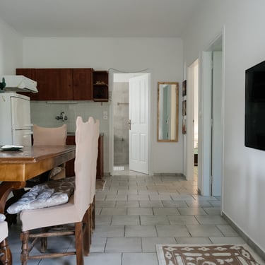 Užėję į namelį Artemis pateksite į bendrą virtuvės ir svetainės zoną, kurioje jaukių namų įspūdį sukuria židinys. Pro langą atsiveria gražus vaizdas, nes tolumoje matosi kalnai. Iš svetainės patenkama į kiemelį, kur jaukiai prisėdę terasoje, galite ne tik mėgautis kavos pertraukėlėmis, bet ir leisti šiltus vakarus gryname ore grilindami.